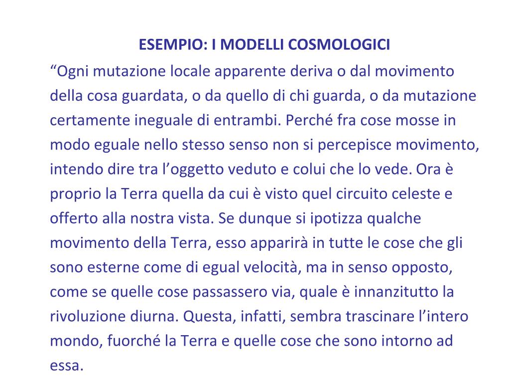 ESEMPIO: I MODELLI COSMOLOGICI “Ogni mutazione locale apparente deriva o dal movimento della cosa guardata, o da quello di chi guarda, o da mutazione certamente ineguale di entrambi. Perché fra cose mosse in modo eguale nello stesso senso non si percepisce movimento, intendo dire tra l’oggetto veduto e colui che lo vede. Ora è proprio la Terra quella da cui è visto quel circuito celeste e offerto alla nostra vista. Se dunque si ipotizza qualche movimento della Terra, esso apparirà in tutte le cose che gli sono esterne come di egual velocità, ma in senso opposto, come se quelle cose passassero via, quale è innanzitutto la rivoluzione diurna. Questa, infatti, sembra trascinare l’intero mondo, fuorché la Terra e quelle cose che sono intorno ad essa.