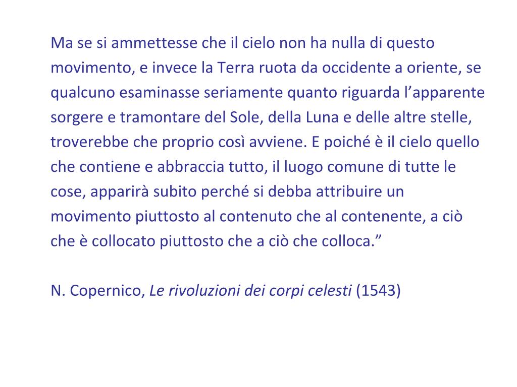 Ma se si ammettesse che il cielo non ha nulla di questo movimento, e invece la Terra ruota da occidente a oriente, se qualcuno esaminasse seriamente quanto riguarda l’apparente sorgere e tramontare del Sole, della Luna e delle altre stelle, troverebbe che proprio così avviene. E poiché è il cielo quello che contiene e abbraccia tutto, il luogo comune di tutte le cose, apparirà subito perché si debba attribuire un movimento piuttosto al contenuto che al contenente, a ciò che è collocato piuttosto che a ciò che colloca.” N. Copernico, Le rivoluzioni dei corpi celesti (1543)