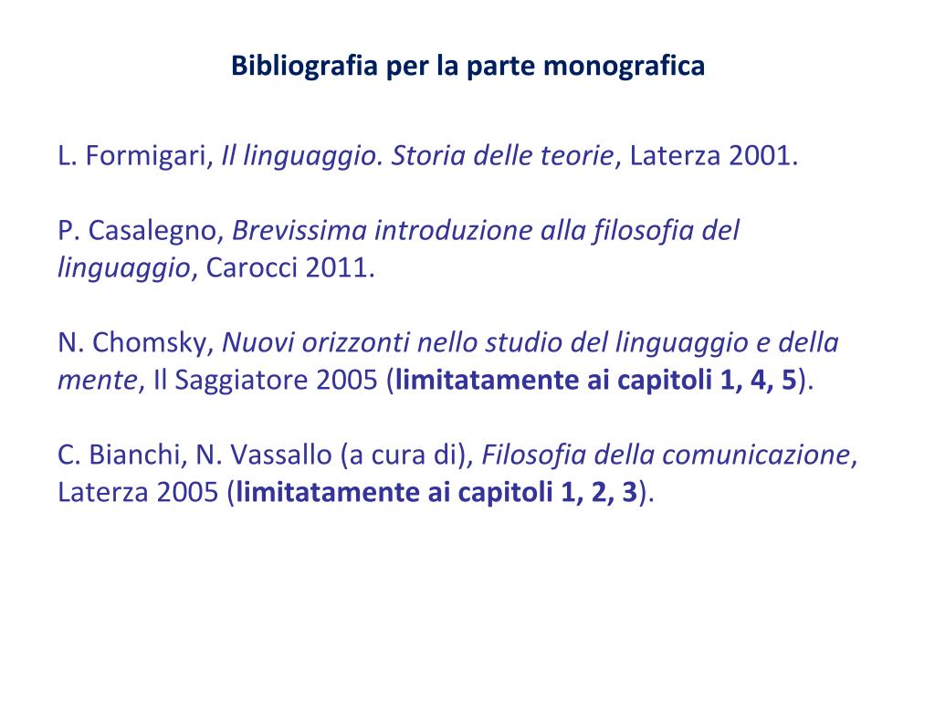 Bibliografia per la parte monografica L. Formigari, Il linguaggio. Storia delle teorie, Laterza 2001.P. Casalegno, Brevissima introduzione alla filosofia del linguaggio, Carocci 2011.N. Chomsky, Nuovi orizzonti nello studio del linguaggio e della mente, Il Saggiatore 2005 (limitatamente ai capitoli 1, 4, 5).C. Bianchi, N. Vassallo (a cura di), Filosofia della comunicazione, Laterza 2005 (limitatamente ai capitoli 1, 2, 3).