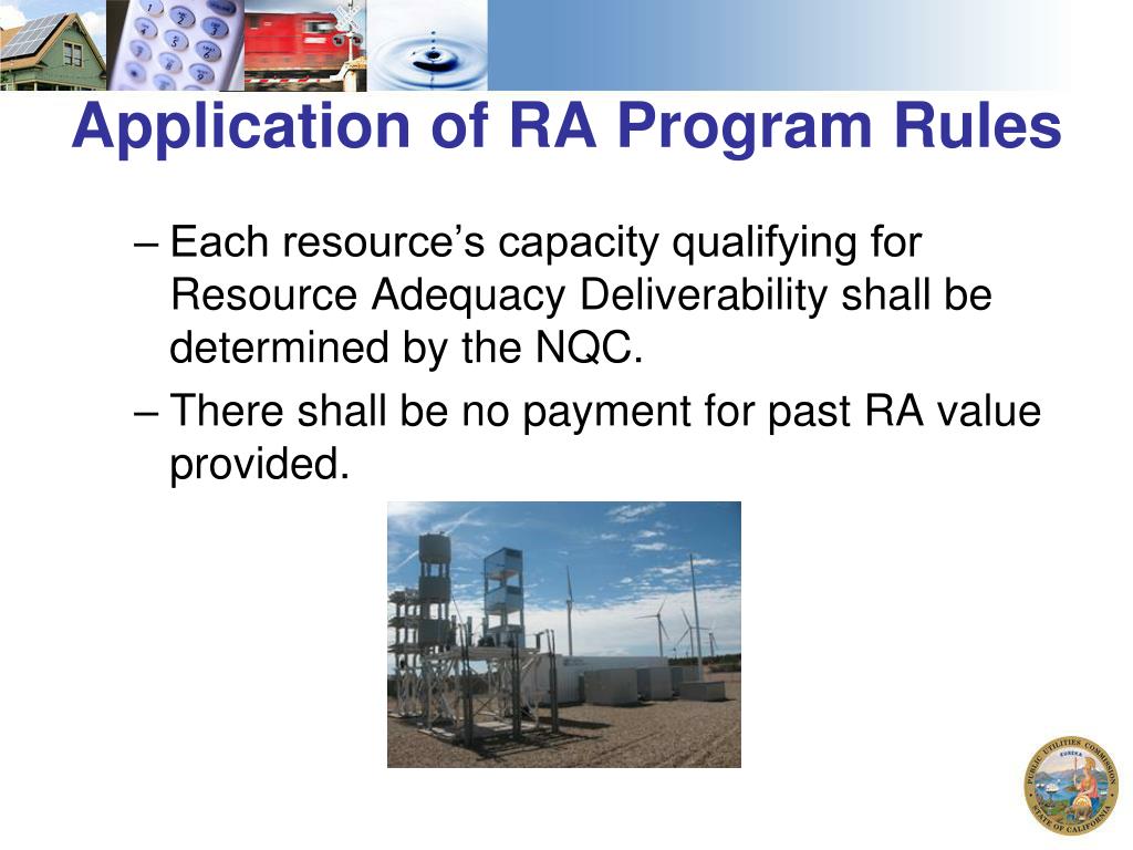 Application of RA Program Rules • Each resource’s capacity qualifying for Resource Adequacy Deliverability shall be determined by the NQC. • There shall be no payment for past RA value provided.
