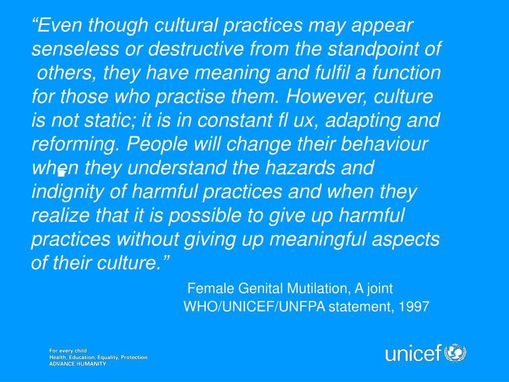 “Even though cultural practices may appearsenseless or destructive from the standpoint of others, they have meaning and fulfil a functionfor those who practise them. However, cultureis not static; it is in constant fl ux, adapting andreforming. People will change their behaviourwhen they understand the hazards andindignity of harmful practices and when theyrealize that it is possible to give up harmfulpractices without giving up meaningful aspectsof their culture.” Female Genital Mutilation, A joint WHO/UNICEF/UNFPA statement, 1997