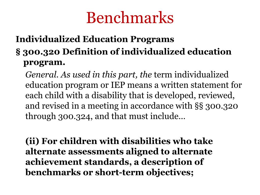 Benchmarks Individualized Education Programs § 300.320 Definition of individualized education program. General. As used in this part, the term individualized education program or IEP means a written statement for each child with a disability that is developed, reviewed, and revised in a meeting in accordance with §§ 300.320 through 300.324, and that must include… (ii) For children with disabilities who take alternate assessments aligned to alternate achievement standards, a description of benchmarks or short-term objectives;