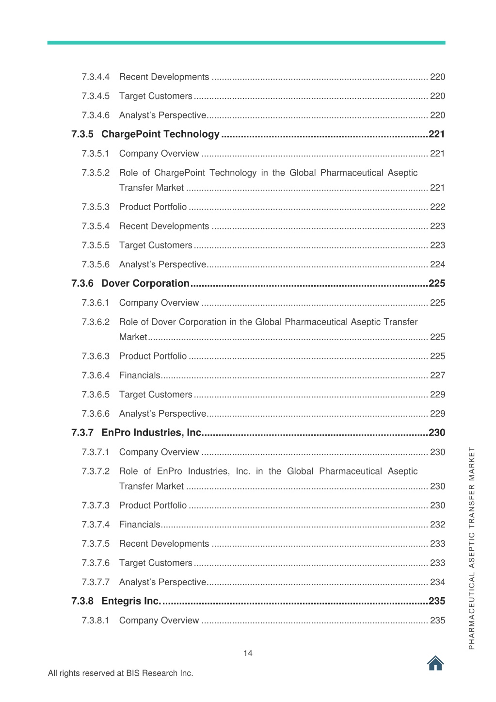 7.3.4.4 Recent Developments ..................................................................................... 220 7.3.4.5 Target Customers ............................................................................................ 220 7.3.4.6 Analyst’s Perspective ....................................................................................... 220 7.3.5ChargePoint Technology .......................................................................... 221 7.3.5.1 Company Overview ......................................................................................... 221 7.3.5.2 Role of ChargePoint Technology in the Global Pharmaceutical Aseptic Transfer Market ............................................................................................... 221 7.3.5.3 Product Portfolio .............................................................................................. 222 7.3.5.4 Recent Developments ..................................................................................... 223 7.3.5.5 Target Customers ............................................................................................ 223 7.3.5.6 Analyst’s Perspective ....................................................................................... 224 7.3.6Dover Corporation ..................................................................................... 225 7.3.6.1 Company Overview ......................................................................................... 225 7.3.6.2 Role of Dover Corporation in the Global Pharmaceutical Aseptic Transfer Market .............................................................................................................. 225 7.3.6.3 Product Portfolio .............................................................................................. 225 7.3.6.4 Financials ......................................................................................................... 227 7.3.6.5 Target Customers ............................................................................................ 229 7.3.6.6 Analyst’s Perspective ....................................................................................... 229 7.3.7EnPro Industries, Inc. ................................................................................ 230 PHARMACEUTICAL ASEPTIC TRANSFER MARKET 7.3.7.1 Company Overview ......................................................................................... 230 7.3.7.2 Role of EnPro Industries, Inc. in the Global Pharmaceutical Aseptic Transfer Market ............................................................................................... 230 7.3.7.3 Product Portfolio .............................................................................................. 230 7.3.7.4 Financials ......................................................................................................... 232 7.3.7.5 Recent Developments ..................................................................................... 233 7.3.7.6 Target Customers ............................................................................................ 233 7.3.7.7 Analyst’s Perspective ....................................................................................... 234 7.3.8Entegris Inc. ............................................................................................... 235 7.3.8.1 Company Overview ......................................................................................... 235 14 All rights reserved at BIS Research Inc.