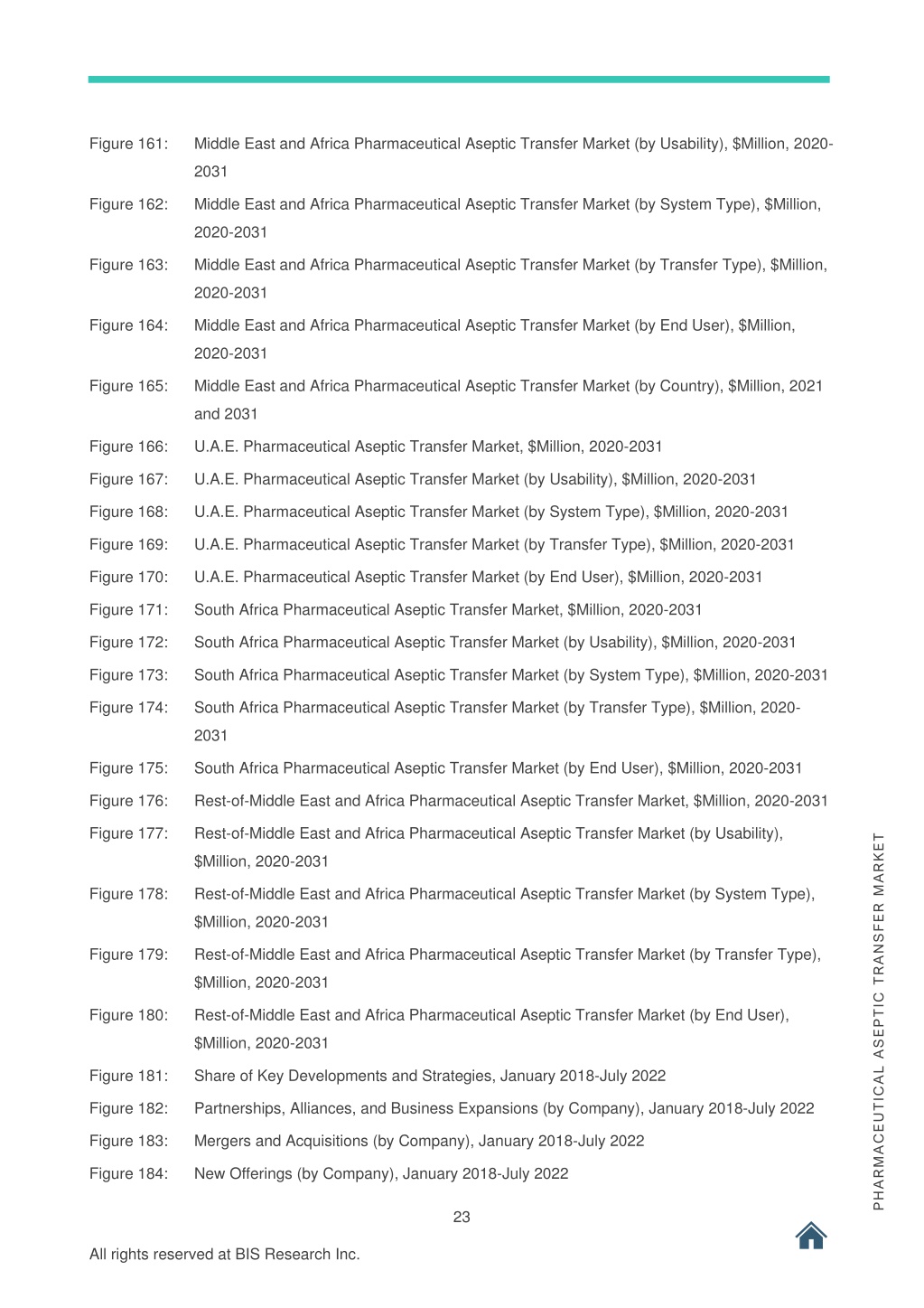 Figure 161: Middle East and Africa Pharmaceutical Aseptic Transfer Market (by Usability), $Million, 2020- 2031 Figure 162: Middle East and Africa Pharmaceutical Aseptic Transfer Market (by System Type), $Million, 2020-2031 Figure 163: Middle East and Africa Pharmaceutical Aseptic Transfer Market (by Transfer Type), $Million, 2020-2031 Figure 164: Middle East and Africa Pharmaceutical Aseptic Transfer Market (by End User), $Million, 2020-2031 Figure 165: Middle East and Africa Pharmaceutical Aseptic Transfer Market (by Country), $Million, 2021 and 2031 Figure 166: U.A.E. Pharmaceutical Aseptic Transfer Market, $Million, 2020-2031 Figure 167: U.A.E. Pharmaceutical Aseptic Transfer Market (by Usability), $Million, 2020-2031 Figure 168: U.A.E. Pharmaceutical Aseptic Transfer Market (by System Type), $Million, 2020-2031 Figure 169: U.A.E. Pharmaceutical Aseptic Transfer Market (by Transfer Type), $Million, 2020-2031 Figure 170: U.A.E. Pharmaceutical Aseptic Transfer Market (by End User), $Million, 2020-2031 Figure 171: South Africa Pharmaceutical Aseptic Transfer Market, $Million, 2020-2031 Figure 172: South Africa Pharmaceutical Aseptic Transfer Market (by Usability), $Million, 2020-2031 Figure 173: South Africa Pharmaceutical Aseptic Transfer Market (by System Type), $Million, 2020-2031 Figure 174: South Africa Pharmaceutical Aseptic Transfer Market (by Transfer Type), $Million, 2020- 2031 Figure 175: South Africa Pharmaceutical Aseptic Transfer Market (by End User), $Million, 2020-2031 Figure 176: Rest-of-Middle East and Africa Pharmaceutical Aseptic Transfer Market, $Million, 2020-2031 Figure 177: Rest-of-Middle East and Africa Pharmaceutical Aseptic Transfer Market (by Usability), PHARMACEUTICAL ASEPTIC TRANSFER MARKET $Million, 2020-2031 Figure 178: Rest-of-Middle East and Africa Pharmaceutical Aseptic Transfer Market (by System Type), $Million, 2020-2031 Figure 179: Rest-of-Middle East and Africa Pharmaceutical Aseptic Transfer Market (by Transfer Type), $Million, 2020-2031 Figure 180: Rest-of-Middle East and Africa Pharmaceutical Aseptic Transfer Market (by End User), $Million, 2020-2031 Figure 181: Share of Key Developments and Strategies, January 2018-July 2022 Figure 182: Partnerships, Alliances, and Business Expansions (by Company), January 2018-July 2022 Figure 183: Mergers and Acquisitions (by Company), January 2018-July 2022 Figure 184: New Offerings (by Company), January 2018-July 2022 23 All rights reserved at BIS Research Inc.