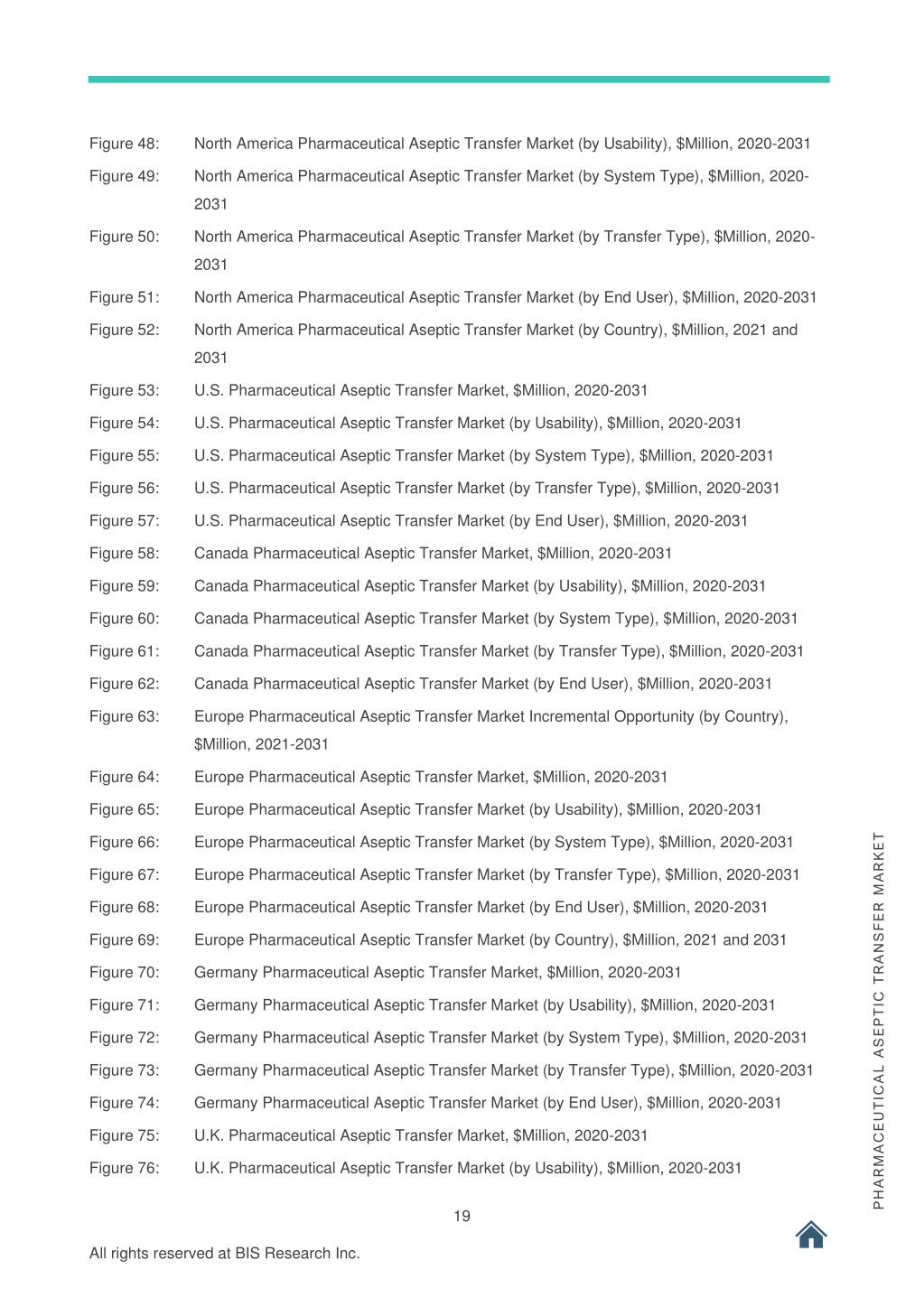 Figure 25: Global Pharmaceutical Aseptic Transfer Market, Growth Share Matrix (by Usability), 2021- 2031 Figure 26: Global Pharmaceutical Aseptic Transfer Market (Single-Use), $Million, 2020-2031 Figure 27: Global Pharmaceutical Aseptic Transfer Market (Multiple-Use), $Million, 2020-2031 Figure 28: Global Pharmaceutical Aseptic Transfer Market (by System Type) Figure 29: Global Pharmaceutical Aseptic Transfer Market Incremental Opportunity (by System Type), $Million, 2021-2031 Figure 30: Global Pharmaceutical Aseptic Transfer Market, Growth-Share Matrix (by System Type), 2021-2031 Figure 31: Global Pharmaceutical Aseptic Transfer Market (Solid Transfer System), $Million, 2020-2031 Figure 32: Global Pharmaceutical Aseptic Transfer Market (Liquid Transfer System), $Million, 2020- 2031 Figure 33: Global Pharmaceutical Aseptic Transfer Market (by End User) Figure 34: Global Pharmaceutical Aseptic Transfer Market, Incremental Opportunity (by End User), $Million, 2021-2031 Figure 35: Global Pharmaceutical Aseptic Transfer Market, Growth-Share Matrix (by End User), 2021- 2031 Figure 36: Global Pharmaceutical Aseptic Transfer Market (Pharmaceutical Companies), $Million, 2020- 2031 Figure 37: Global Pharmaceutical Aseptic Transfer Market (Contract Development and Manufacturing Organizations), $Million, 2020-2031 Figure 38: Global Pharmaceutical Aseptic Transfer Market (Others), $Million, 2020-2031 Figure 39: Global Pharmaceutical Aseptic Transfer Market (by Transfer Type) PHARMACEUTICAL ASEPTIC TRANSFER MARKET Figure 40: Global Pharmaceutical Aseptic Transfer Market, Incremental Opportunity (by Transfer Type), $Million, 2021-2031 Figure 41: Global Pharmaceutical Aseptic Transfer Market, Growth-Share Matrix (by Transfer Type), 2021-2031 Figure 42: Global Pharmaceutical Aseptic Transfer Market (Ports), $Million, 2020-2031 Figure 43: Global Pharmaceutical Aseptic Transfer Market (Portbags), $Million, 2020-2031 Figure 44: Global Pharmaceutical Aseptic Transfer Market (Others), $Million, 2020-2031 Figure 45: Global Pharmaceutical Aseptic Transfer Market Share (by Region), 2021-2031 Figure 46: North America Pharmaceutical Aseptic Transfer Market Incremental Opportunity (by Country), $Million, 2021-2031 Figure 47: North America Pharmaceutical Aseptic Transfer Market, $Million, 2020-2031 18 All rights reserved at BIS Research Inc.