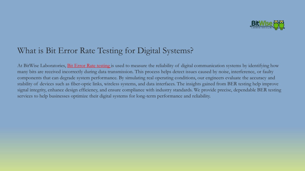 Bit Error Rate Testing for Digital Systems AtBitWise Laboratories, we specialize in Bit Error Rate (BER) testing to ensure the accuracy and reliability of digital communication systems. BER testing measures how often errors occur during data transmission, helping identify issues caused by noise, interference, or hardware faults. Our advanced testing equipment and precise analysis methods allow us to evaluate system performance under real-world conditions. Whether you’re developing fiber-optic networks, wireless systems, or high-speed data interfaces, our engineers provide detailed insights to help you optimize design and improve data integrity. Trust us to deliver dependable BER testing solutions that support innovation, compliance, and long-term system stability for your digital communication projects.