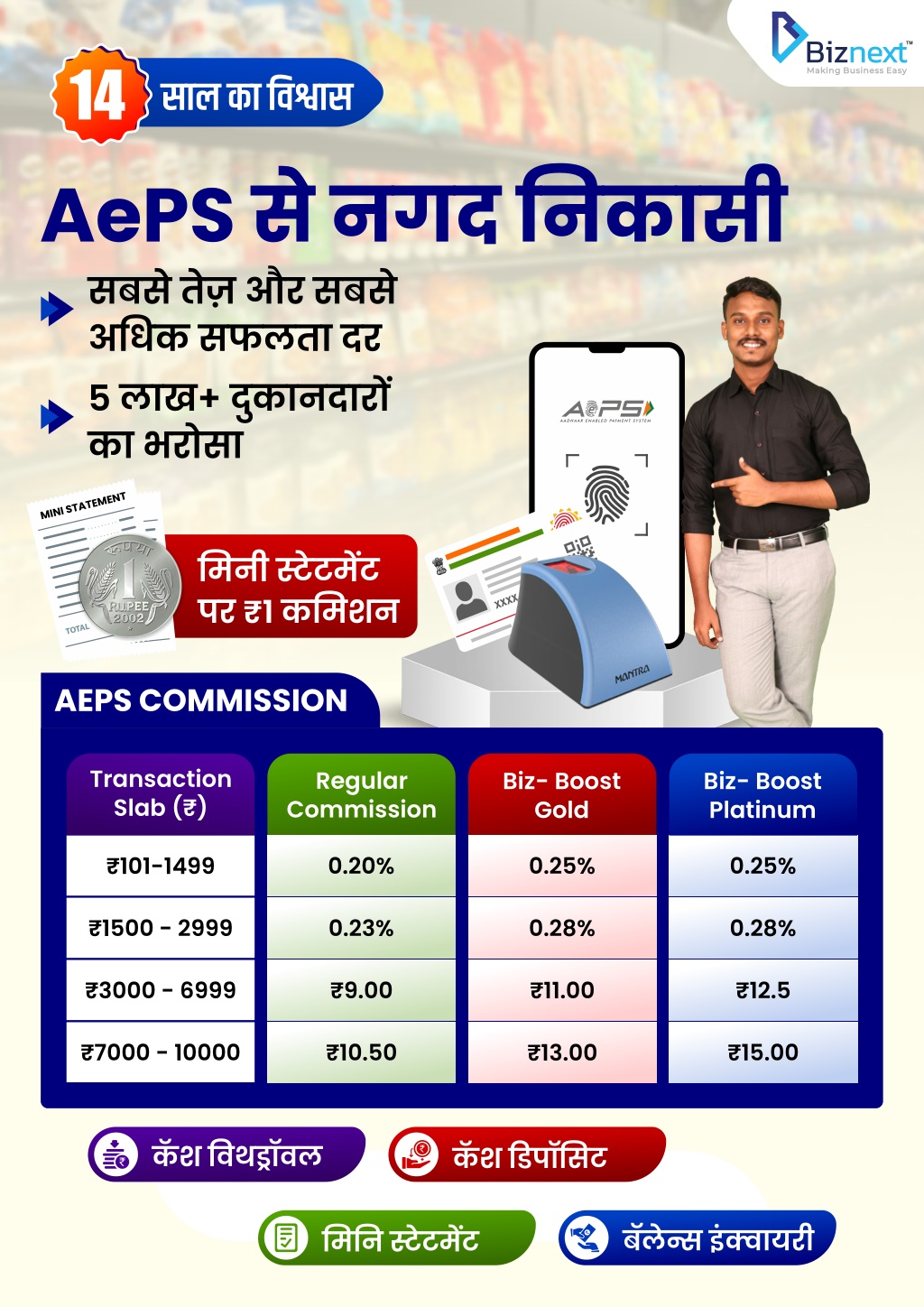 14 साल का ?व?ास लाख? दक ु ानदार? क? पहली पसंद 30+ सेवाएं एक ही ?ेटफॉम? पर सबसे तेज़ और ??र पोट?ल AEPS म? सबसे ?ादा Success Rate भारत का सबसे एडवांस ?रटेलर पोट?ल अब जुड़ ? Biznext क े साथ और बढ़ाएँ अपनी कमाई! Join Biznext Download Our App 022 42123000 biznext.in