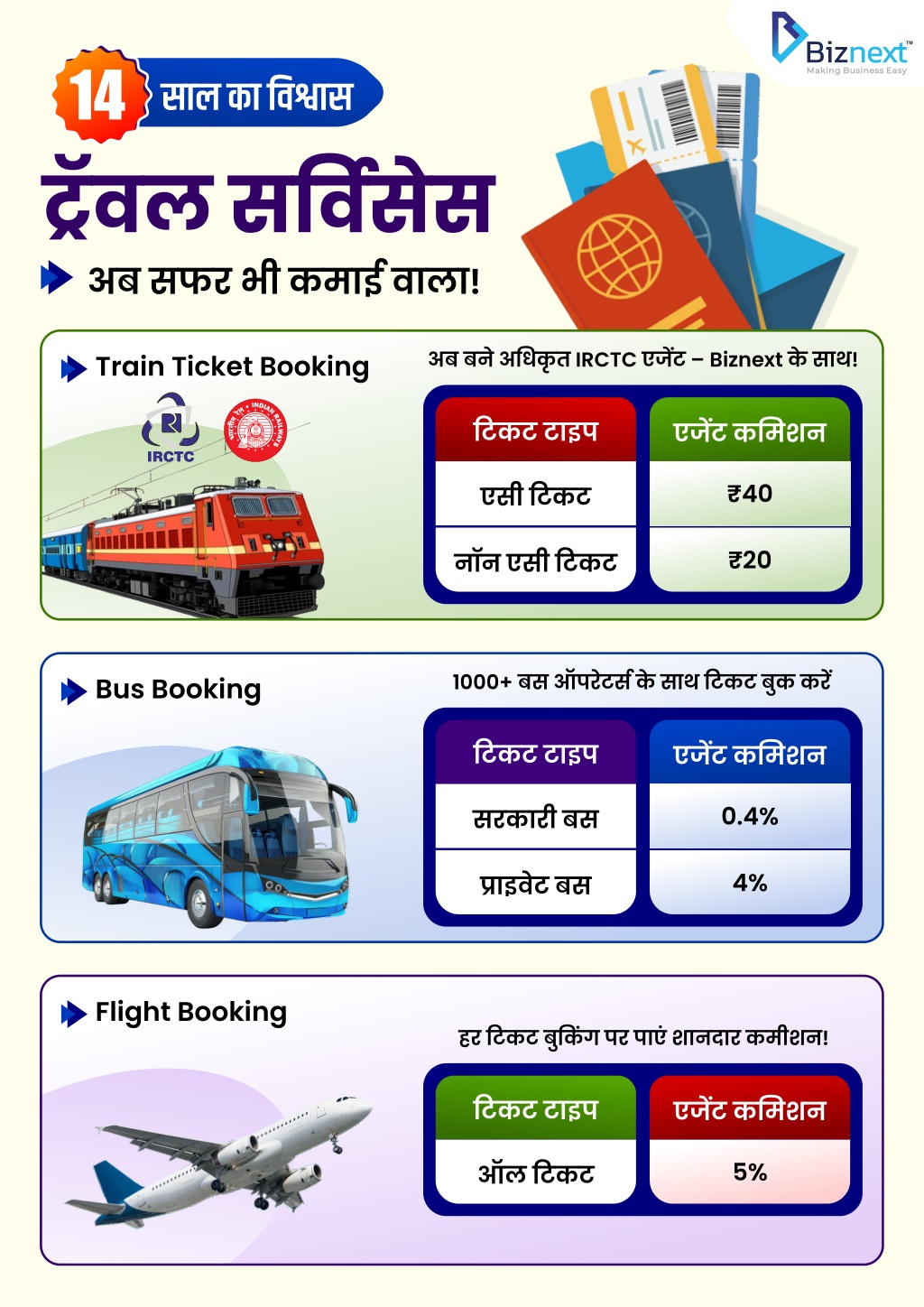 14 ?ॅवल स?वसेस अब सफर भी कमाई वाला! साल का ?व?ास ? अब बने अ?धक ृ त IRCTC एज?ट – Biznext क े साथ! Train Ticket Booking ?टकट टाइप एज?ट क?मशन ₹40 एसी ?टकट ₹20 नॉन एसी ?टकट 1000+ बस ऑपरट े स? क े साथ ?टकट बुक कर? Bus Booking ?टकट टाइप एज?ट क?मशन 0.4% सरकारी बस 4% ?ाइवेट बस Flight Booking हर ?टकट बु?कग पर पाएं शानदार कमीशन! ? ?टकट टाइप एज?ट क?मशन ५% ऑल ?टकट