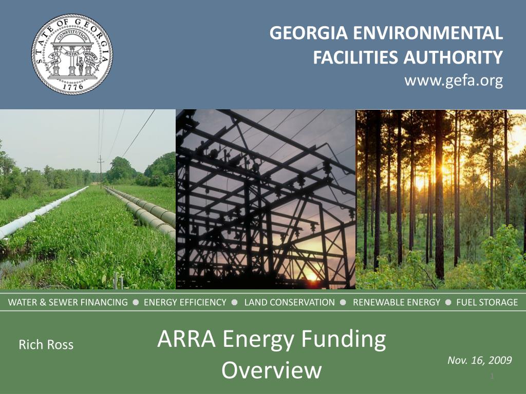 GEORGIA ENVIRONMENTAL FACILITIES AUTHORITY www.gefa.org. WATER & SEWER FINANCING ENERGY EFFICIENCY LAND CONSERVATION RENEWABLE ENERGY FUEL STORAGE. ARRA Energy Funding Overview. Rich Ross. Nov. 16, 2009. GEORGIA ENVIRONMENTAL FACILITIES AUTHORITY. Mission Statement.