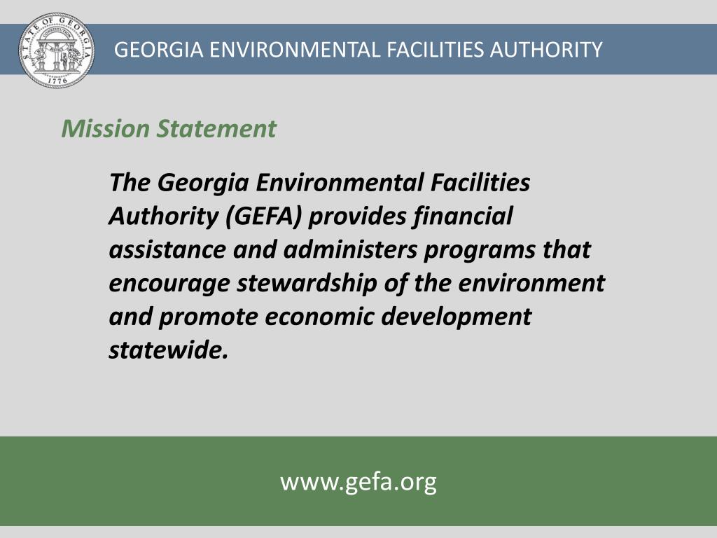 GEORGIA ENVIRONMENTAL FACILITIES AUTHORITY Mission Statement The Georgia Environmental Facilities Authority (GEFA) provides financial assistance and administers programs that encourage stewardship of the environment and promote economic development statewide. www.gefa.org