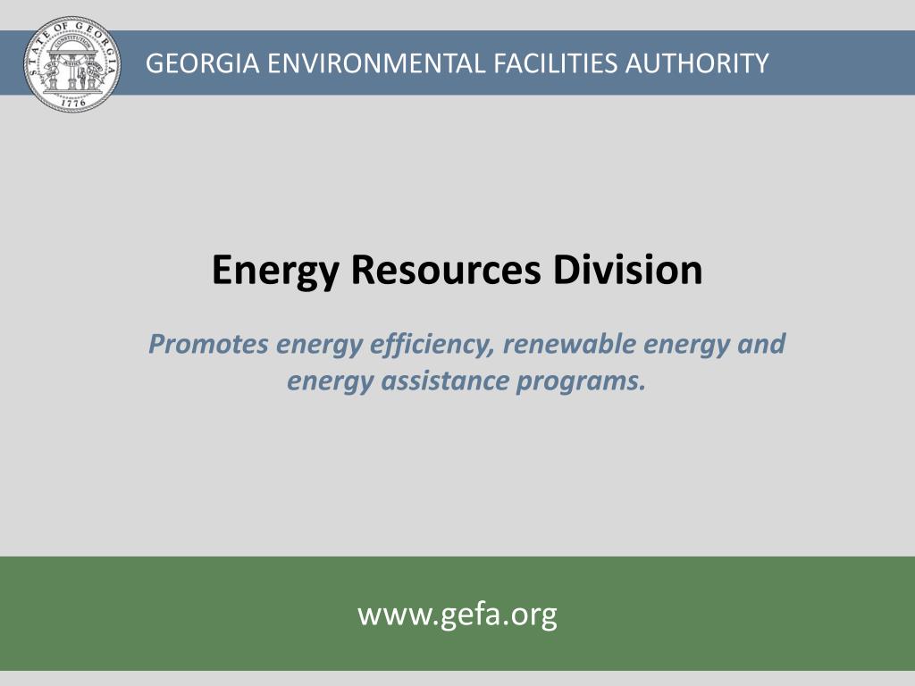 GEORGIA ENVIRONMENTAL FACILITIES AUTHORITY Energy Resources Division Promotes energy efficiency, renewable energy and energy assistance programs. www.gefa.org