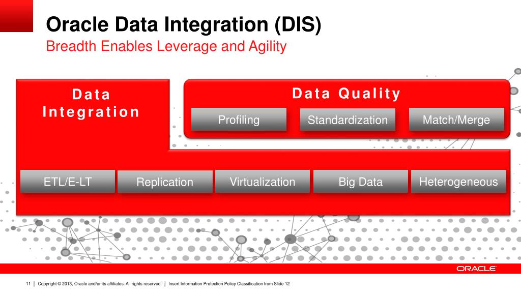Oracle Data Integration (DIS) Breadth Enables Leverage and Agility Data Quality Data Integration Match/Merge Profiling Standardization Heterogeneous Virtualization Big Data ETL/E-LT Replication