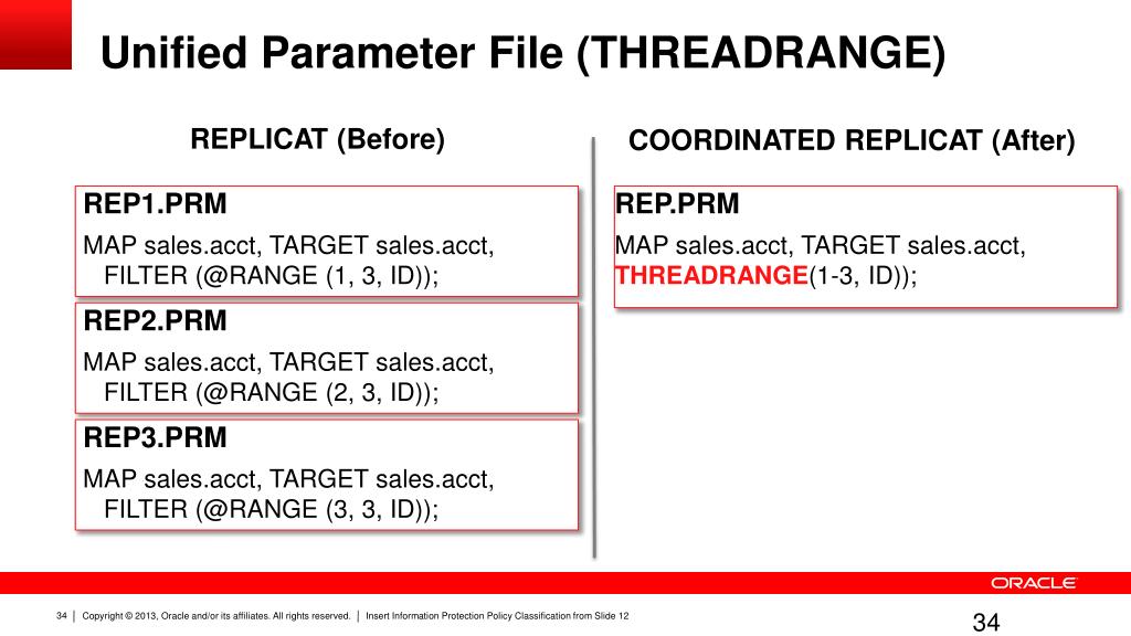 Unified Parameter File (THREADRANGE) REPLICAT (Before) COORDINATED REPLICAT (After) • REP1.PRM • MAP sales.acct, TARGET sales.acct, FILTER (@RANGE (1, 3, ID)); • REP2.PRM • MAP sales.acct, TARGET sales.acct, FILTER (@RANGE (2, 3, ID)); • REP3.PRM • MAP sales.acct, TARGET sales.acct, FILTER (@RANGE (3, 3, ID)); REP.PRM MAP sales.acct, TARGET sales.acct, THREADRANGE(1-3, ID));