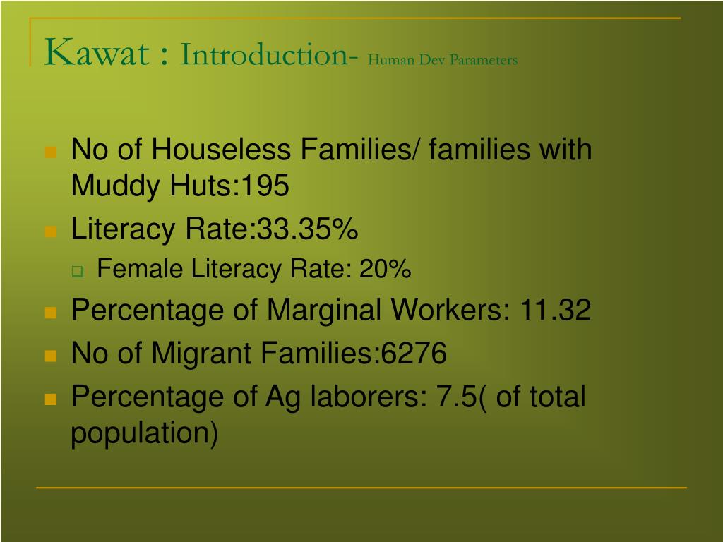 Kawat : Introduction- Human Dev Parameters • No of Houseless Families/ families with Muddy Huts:195 • Literacy Rate:33.35% • Female Literacy Rate: 20% • Percentage of Marginal Workers: 11.32 • No of Migrant Families:6276 • Percentage of Ag laborers: 7.5( of total population)