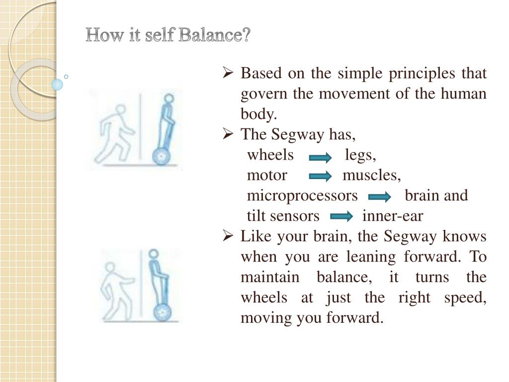 How it self Balance? • Based on the simple principles that govern the movement of the human body. • The Segway has, • wheels legs, • motor muscles, • microprocessors brain and • tilt sensors inner-ear • Like your brain, the Segway knows when you are leaning forward. To maintain balance, it turns the wheels at just the right speed, moving you forward.
