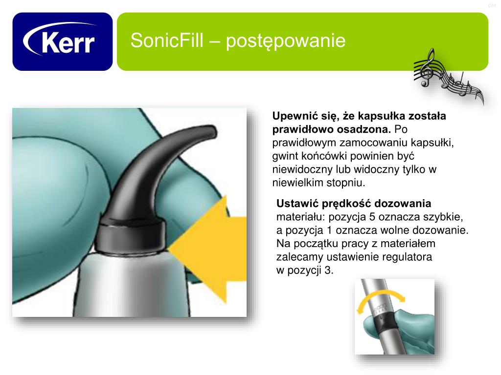 SonicFill – postępowanie Upewnić się, że kapsułka została prawidłowo osadzona. Po prawidłowym zamocowaniu kapsułki, gwint końcówki powinien być niewidoczny lub widoczny tylko w niewielkim stopniu. Ustawić prędkość dozowania materiału: pozycja 5 oznacza szybkie, a pozycja 1 oznacza wolne dozowanie. Na początku pracy z materiałem zalecamy ustawienie regulatora w pozycji 3.