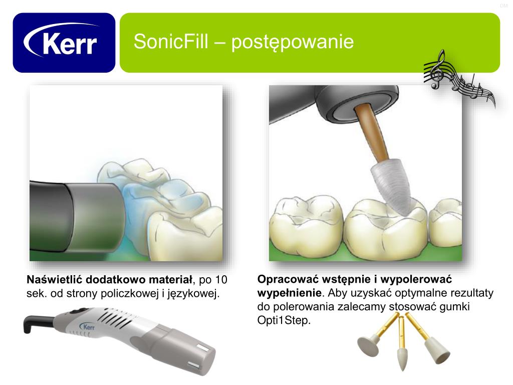 SonicFill – postępowanie Opracować wstępnie i wypolerować wypełnienie. Aby uzyskać optymalne rezultaty do polerowania zalecamy stosować gumki Opti1Step. Naświetlić dodatkowo materiał, po 10 sek. od strony policzkowej i językowej.