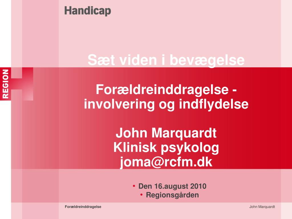 Sæt viden i bevægelse Forældreinddragelse -involvering og indflydelse John Marquardt Klinisk psykolog joma@rcfm.dk. Den 16.august 2010 Regionsgården. Hvorfor skal forældrene inddrages og involveres?. C.P. muskelsvind og hjerneskade findes ikke Der findes mennesker med C.P. m.f .