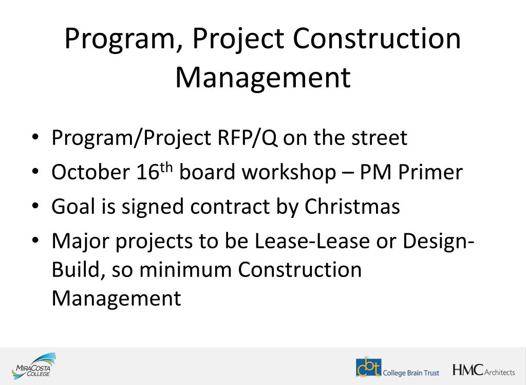 Program, Project Construction Management • Program/Project RFP/Q on the street • October 16th board workshop – PM Primer • Goal is signed contract by Christmas • Major projects to be Lease-Lease or Design-Build, so minimum Construction Management