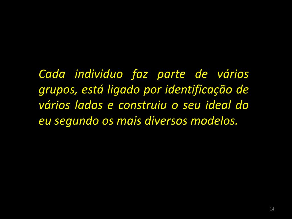 Cada individuo faz parte de vários grupos, está ligado por identificação de vários lados e construiu o seu ideal do eu segundo os mais diversos modelos. 14