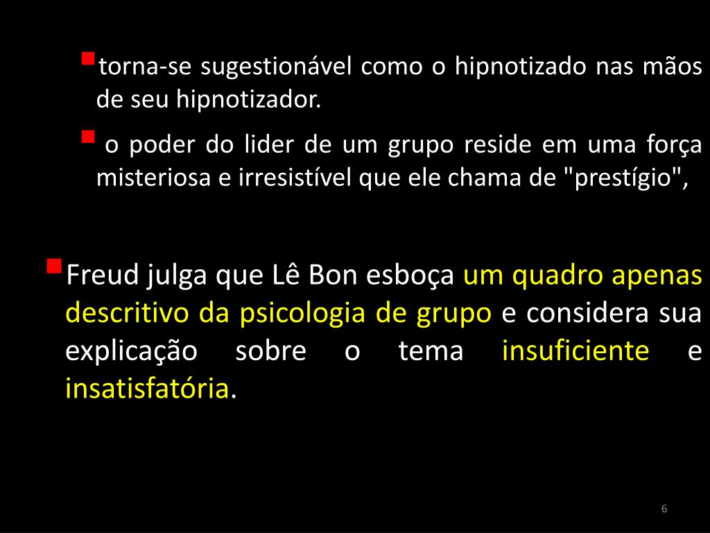 torna-se sugestionável como o hipnotizado nas mãos de seu hipnotizador. • o poder do lider de um grupo reside em uma força misteriosa e irresistível que ele chama de "prestígio", • Freud julga que Lê Bon esboça um quadro apenas descritivo da psicologia de grupo e considera sua explicação sobre o tema insuficiente e insatisfatória. 6