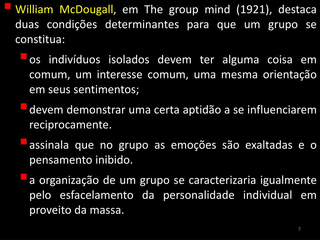 William McDougall, em The groupmind (1921), destaca duas condições determinantes para que um grupo se constitua: • os indivíduos isolados devem ter alguma coisa em comum, um interesse comum, uma mesma orientação em seus sentimentos; • devem demonstrar uma certa aptidão a se influenciarem reciprocamente. • assinala que no grupo as emoções são exaltadas e o pensamento inibido. • a organização de um grupo se caracterizaria igualmente pelo esfacelamento da personalidade individual em proveito da massa. 7