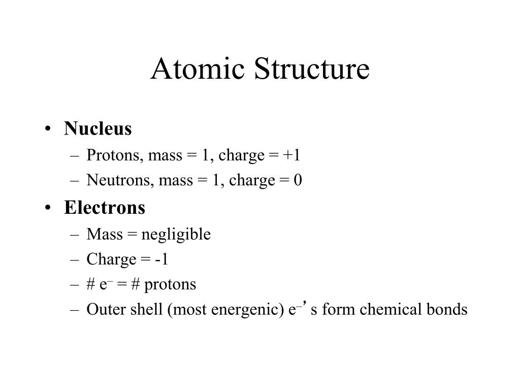 Atomic Structure • Nucleus • Protons, mass = 1, charge = +1 • Neutrons, mass = 1, charge = 0 • Electrons • Mass = negligible • Charge = -1 • # e– = # protons • Outer shell (most energenic) e–’s form chemical bonds