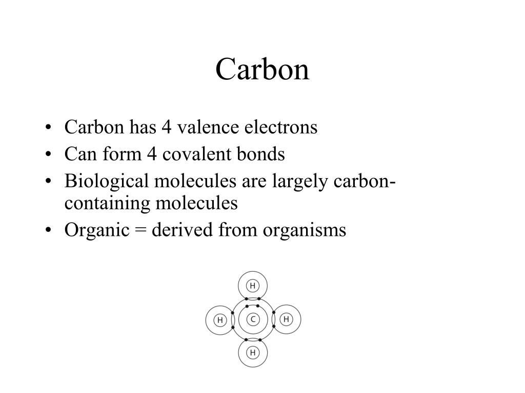 Carbon • Carbon has 4 valence electrons • Can form 4 covalent bonds • Biological molecules are largely carbon-containing molecules • Organic = derived from organisms