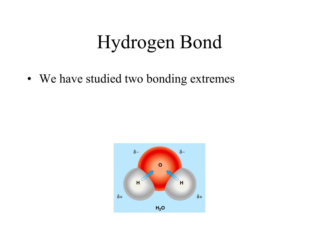 Hydrogen Bond • We have studied two bonding extremes • Covalent bond = atoms share electrons