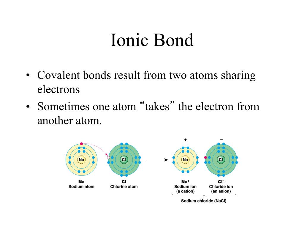 Ionic Bond • Covalent bonds result from two atoms sharing electrons • Sometimes one atom “takes” the electron from another atom.