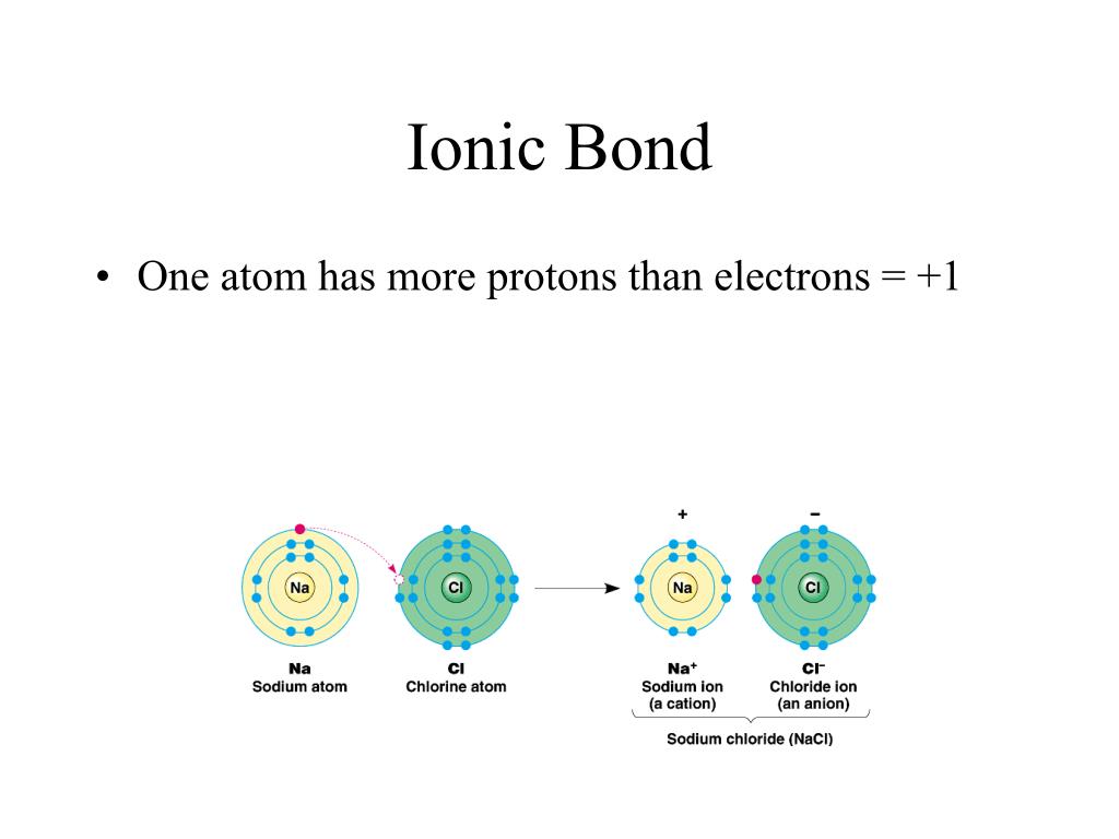 Ionic Bond • One atom has more protons than electrons = +1 • Other atom has one more electron than protons = -1