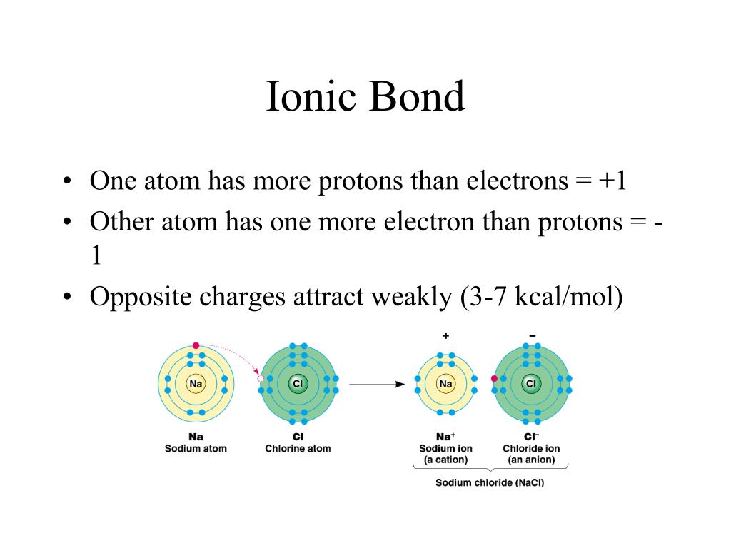 Ionic Bond • One atom has more protons than electrons = +1 • Other atom has one more electron than protons = -1 • Opposite charges attract weakly (3-7 kcal/mol)