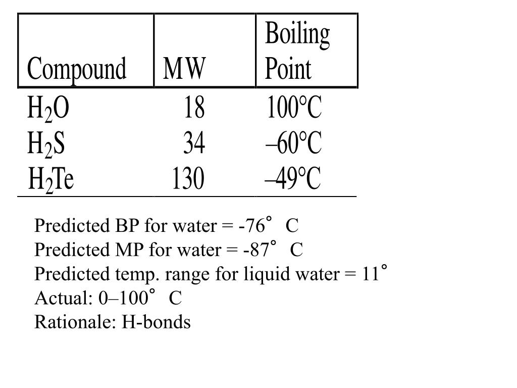 Predicted BP for water = -76°C Predicted MP for water = -87°C Predicted temp. range for liquid water = 11° Actual: 0–100°C Rationale: H-bonds