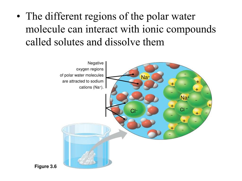 – Na+ + + – + – – Na+ – + + Cl – Cl– + – – + – + – – Figure 3.6 • The different regions of the polar water molecule can interact with ionic compounds called solutes and dissolve them