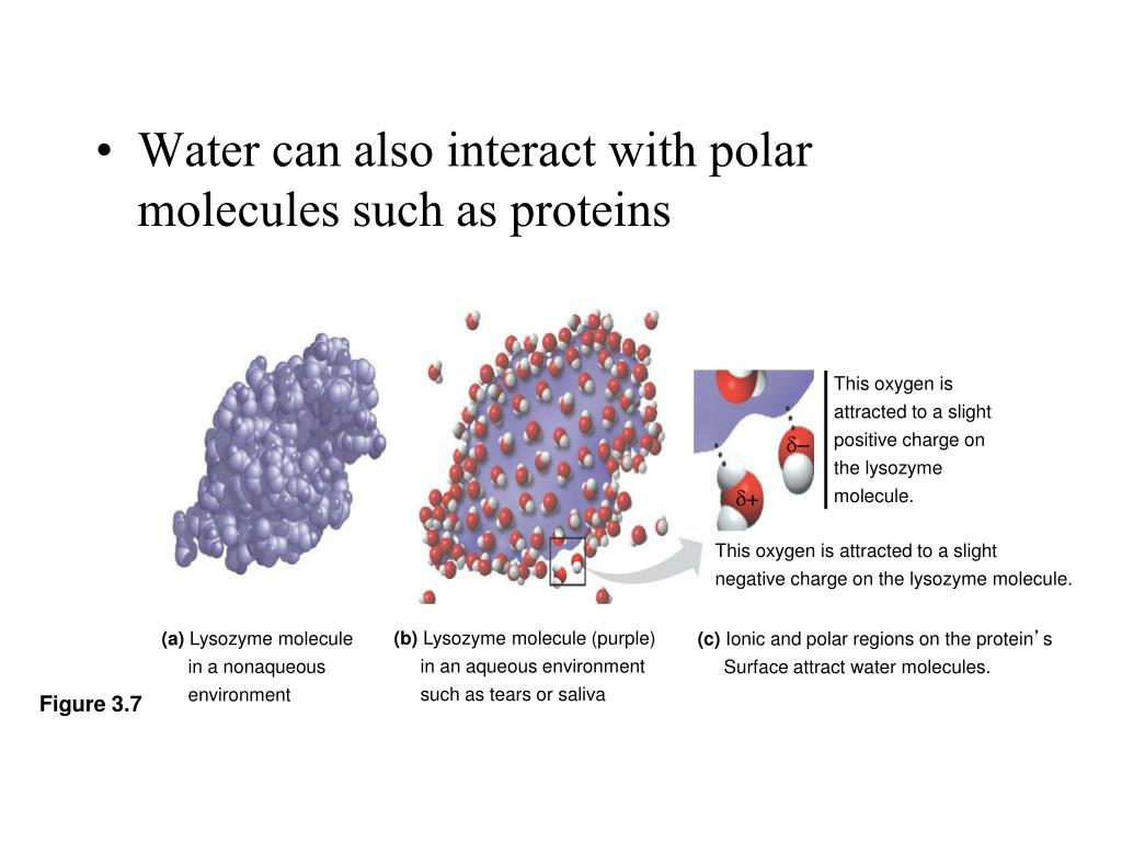 This oxygen is attracted to a slight positive charge on the lysozyme molecule. – + This oxygen is attracted to a slight negative charge on the lysozyme molecule. (b) Lysozyme molecule (purple) in an aqueous environment such as tears or saliva (a) Lysozyme molecule in a nonaqueous environment (c) Ionic and polar regions on the protein’s Surface attract water molecules. Figure 3.7 • Water can also interact with polar molecules such as proteins