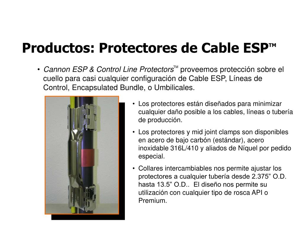 Productos: Protectores de Cable ESPTM • Cannon ESP & Control Line ProtectorsTM proveemos protección sobre el cuello para casi cualquier configuración de Cable ESP, Líneas de Control, Encapsulated Bundle, o Umbilicales. • Los protectores están diseñados para minimizar cualquier daño posible a los cables, líneas o tubería de producción. • Los protectores y mid joint clamps son disponibles en acero de bajo carbón (estándar), acero inoxidable 316L/410 y aliados de Níquel por pedido especial. • Collares intercambiables nos permite ajustar los protectores a cualquier tubería desde 2.375” O.D. hasta 13.5” O.D.. El diseño nos permite su utilización con cualquier tipo de rosca API o Premium.