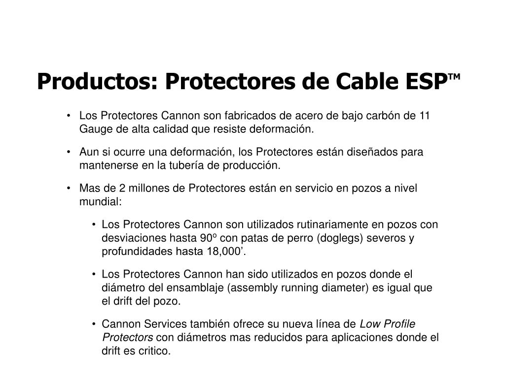 Productos: Protectores de Cable ESPTM • Los Protectores Cannon son fabricados de acero de bajo carbón de 11 Gauge de alta calidad que resiste deformación. • Aun si ocurre una deformación, los Protectores están diseñados para mantenerse en la tubería de producción. • Mas de 2 millones de Protectores están en servicio en pozos a nivel mundial: • Los Protectores Cannon son utilizados rutinariamente en pozos con desviaciones hasta 90o con patas de perro (doglegs) severos y profundidades hasta 18,000’. • Los Protectores Cannon han sido utilizados en pozos donde el diámetro del ensamblaje (assembly running diameter) es igual que el drift del pozo. • Cannon Services también ofrece su nueva línea de Low Profile Protectors con diámetros mas reducidos para aplicaciones donde el drift es critico.