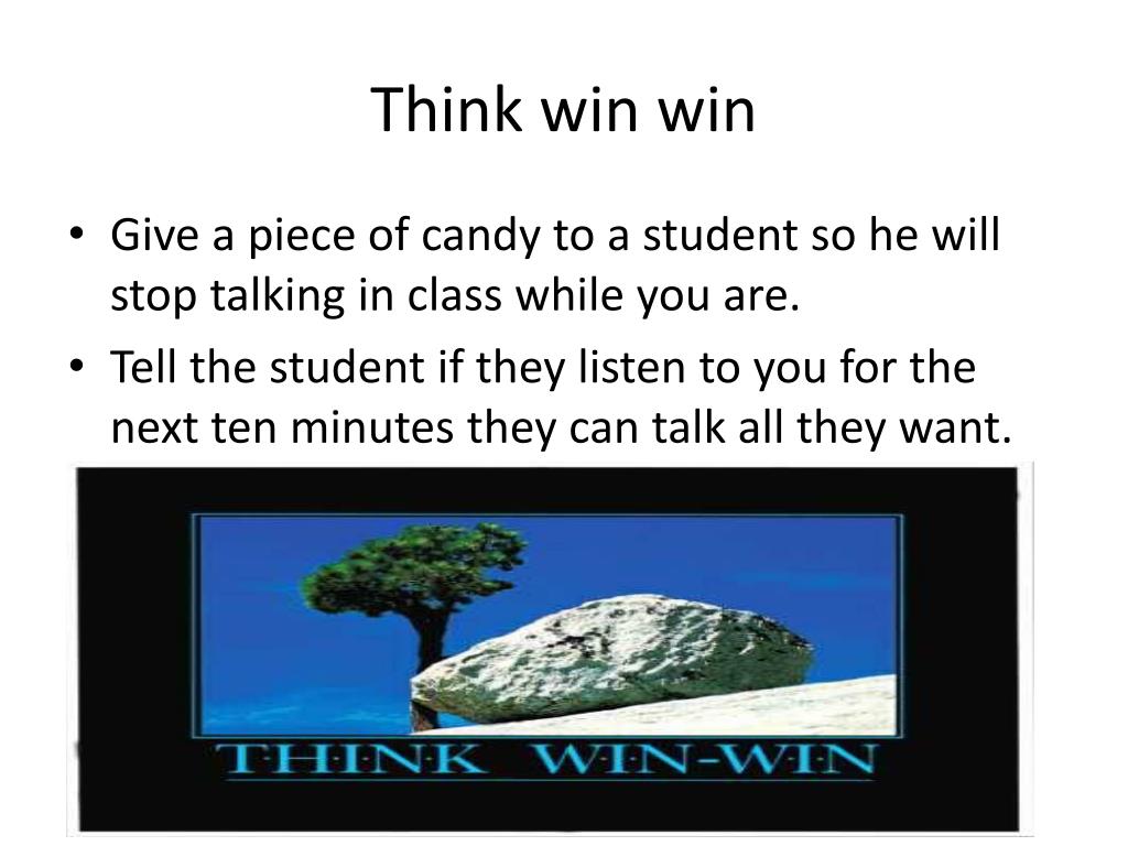 Think win win • Give a piece of candy to a student so he will stop talking in class while you are. • Tell the student if they listen to you for the next ten minutes they can talk all they want.