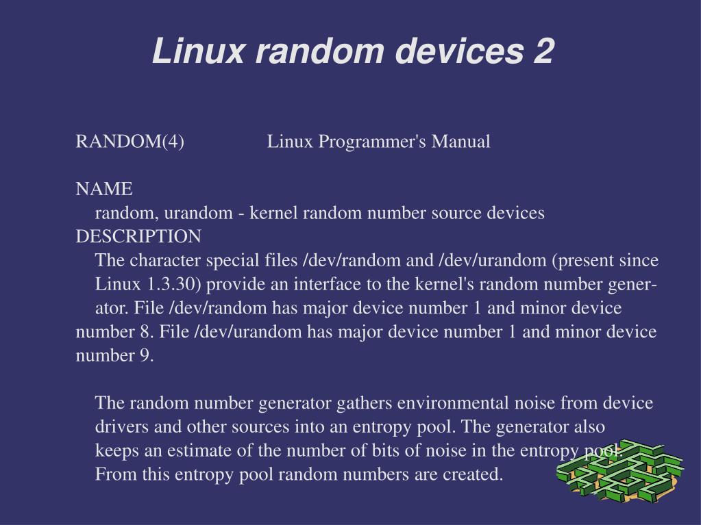 When read, the /dev/random device will only return random bytes within the estimated number of bits of noise in the entropy pool. /dev/random should be suitable for uses that need very high quality randomness such as one-time pad or key generation. When the entropy pool is empty, reads from /dev/random will block until additional environmental noise is gathered. When read, /dev/urandom device will return as many bytes as are requested. As a result, if there is not sufficient entropy in the entropy pool, the returned values are theoretically vulnerable to a cryptographic attack on the algorithms used by the driver. Knowledge of how to do this is not available in the current non-classified liter- ature, but it is theoretically possible that such an attack may exist. If this is a concern in your application, use /dev/random instead. Linux random devices 3