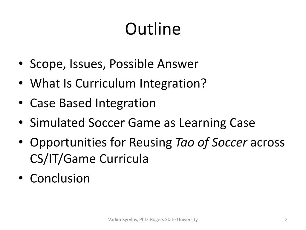 Outline • Scope, Issues, Possible Answer • What Is Curriculum Integration? • Case Based Integration • Simulated Soccer Game as Learning Case • Opportunities for Reusing Tao of Soccer across CS/IT/Game Curricula • Conclusion Vadim Kyrylov, PhD Rogers State University