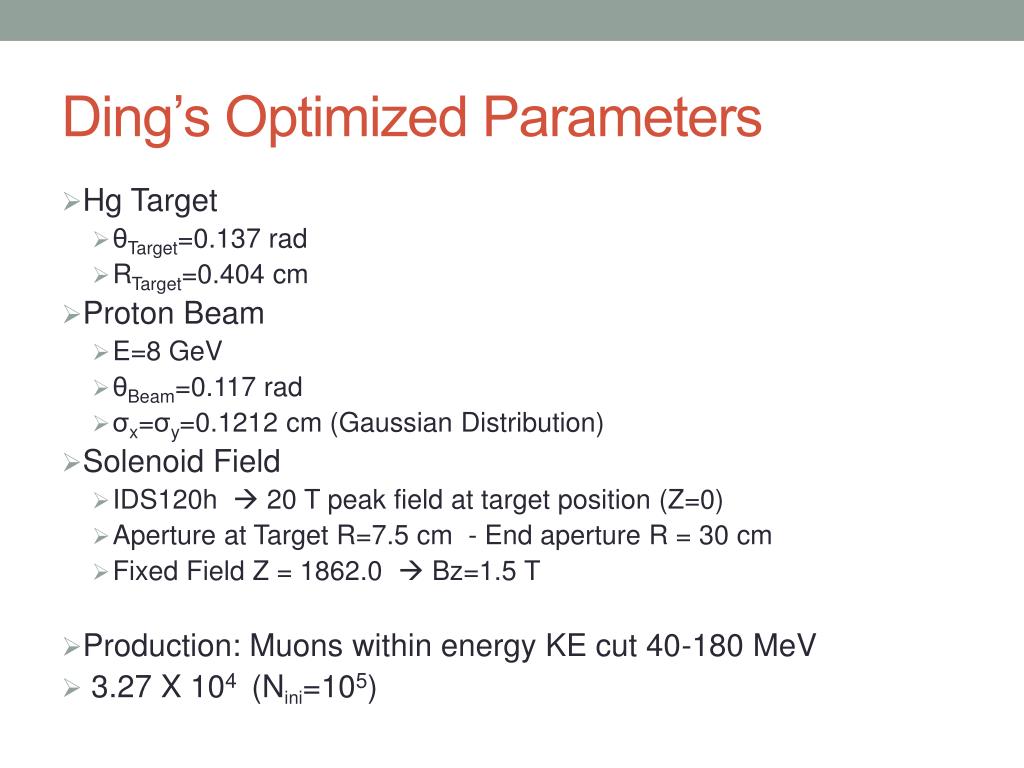 Ding’s Optimized Parameters • Hg Target • θTarget=0.137 rad • RTarget=0.404 cm • Proton Beam • E=8 GeV • θBeam=0.117 rad • σx=σy=0.1212 cm (Gaussian Distribution) • Solenoid Field • IDS120h 20 T peak field at target position (Z=0) • Aperture at Target R=7.5 cm - End aperture R = 30 cm • Fixed Field Z = 1862.0 Bz=1.5 T • Production: Muons within energy KE cut 40-180 MeV • 3.27 X 104 (Nini=105)