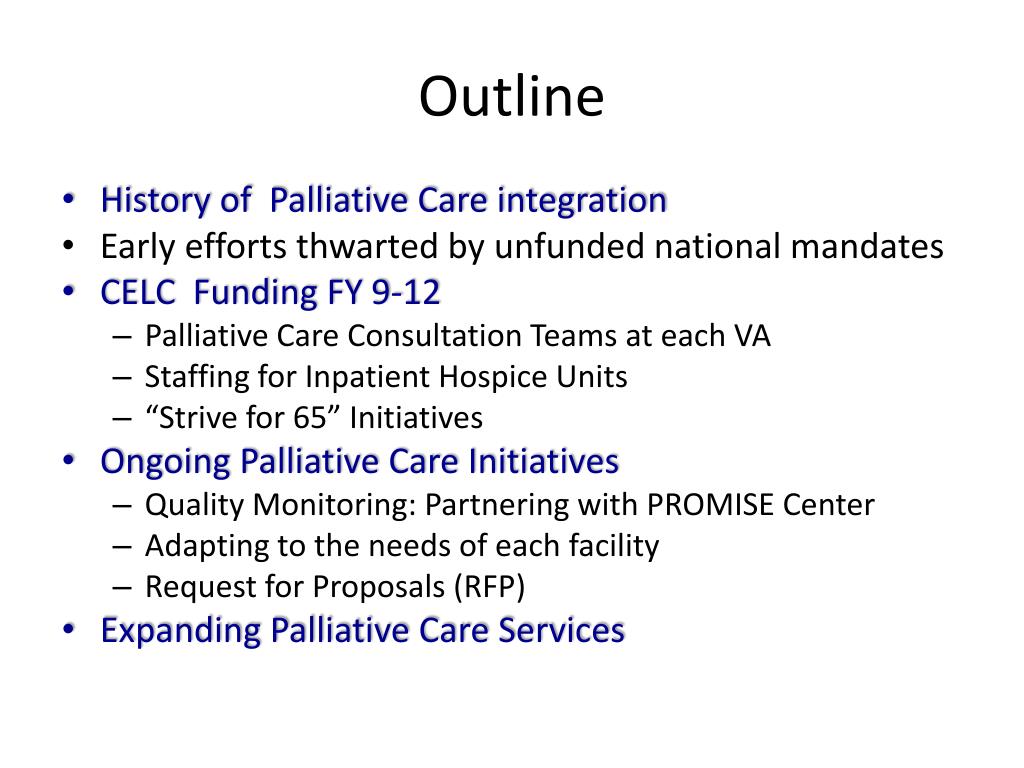 Outline • History of Palliative Care integration • Early efforts thwarted by unfunded national mandates • CELC Funding FY 9-12 • Palliative Care Consultation Teams at each VA • Staffing for Inpatient Hospice Units • “Strive for 65” Initiatives • Ongoing Palliative Care Initiatives • Quality Monitoring: Partnering with PROMISE Center • Adapting to the needs of each facility • Request for Proposals (RFP) • Expanding Palliative Care Services