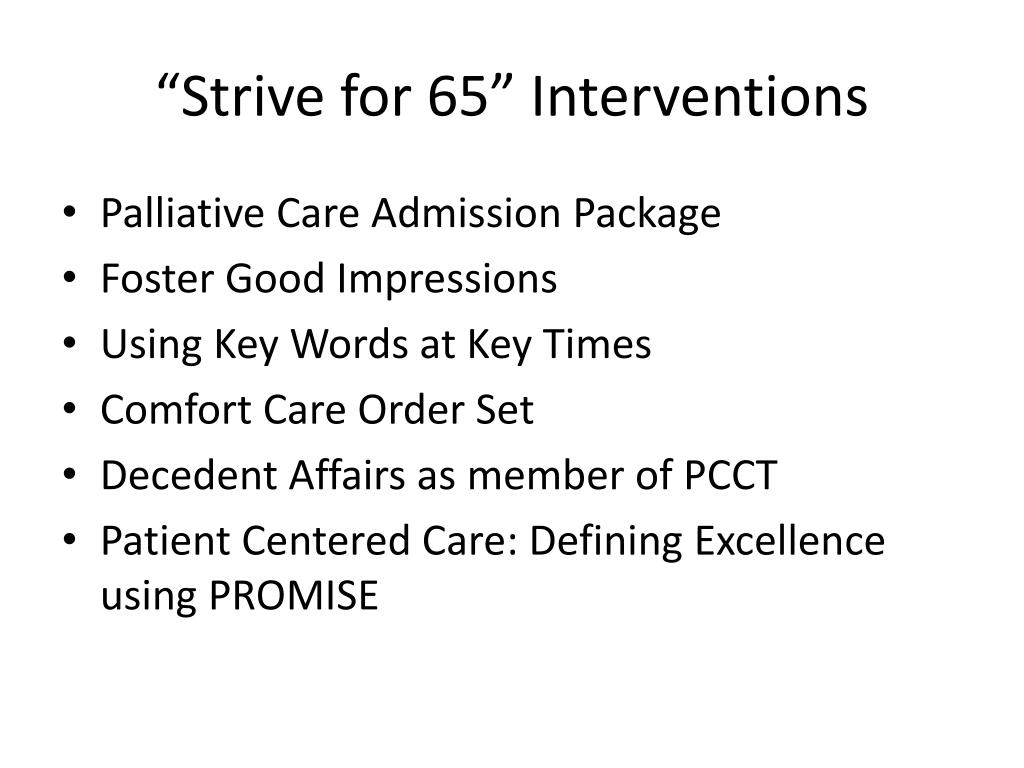 “Strive for 65” Interventions • Palliative Care Admission Package • Foster Good Impressions • Using Key Words at Key Times • Comfort Care Order Set • Decedent Affairs as member of PCCT • Patient Centered Care: Defining Excellence using PROMISE