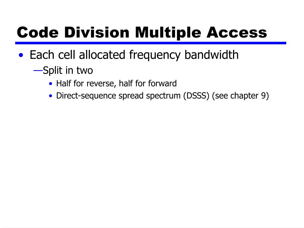 Code Division Multiple Access • Each cell allocated frequency bandwidth • Split in two • Half for reverse, half for forward • Direct-sequence spread spectrum (DSSS) (see chapter 9)