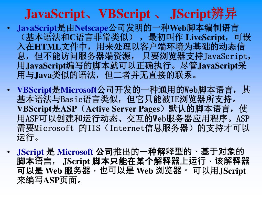 JavaScript、VBScript 、 JScript辨异 • JavaScript是由Netscape公司发明的一种Web脚本编制语言(基本语法和C语言非常类似) ,最初叫作 LiveScript,可嵌入在HTML文件中,用来处理以客户端环境为基础的动态信息,但不能访问服务器端资源, 只要浏览器支持JavaScript,用JavaScript编写的脚本就可以正确执行。尽管JavaScript采用与Java类似的语法,但二者并无直接的联系。 • VBScript是Microsoft公司开发的一种通用的Web脚本语言,其基本语法与Basic语言类似,但它只能被IE浏览器所支持。VBScript是ASP(Active Server Pages)默认的脚本语言,使用ASP可以创建和运行动态、交互的Web服务器应用程序。ASP需要Microsoft 的IIS(Internet信息服务器)的支持才可以运行。 • JScript 是Microsoft公司推出的一种解释型的、基于对象的脚本语言, JScript 脚本只能在某个解释器上运行,该解释器可以是 Web 服务器,也可以是 Web 浏览器。 可以用JScript 来编写ASP页面。