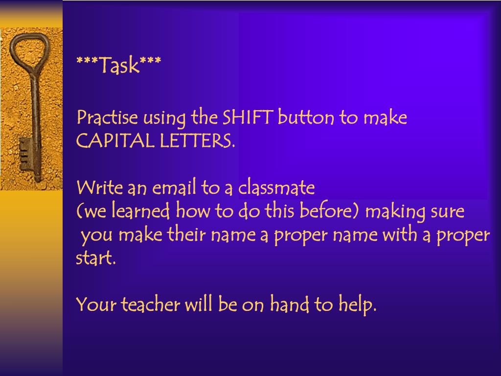 ***Task*** Practise using the SHIFT button to make CAPITAL LETTERS. Write an email to a classmate (we learned how to do this before) making sure you make their name a proper name with a proper start. Your teacher will be on hand to help.