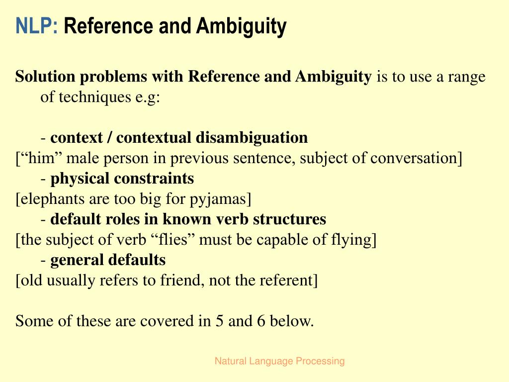 NLP: Reference and Ambiguity Solution problems with Reference and Ambiguity is to use a range of techniques e.g: - context / contextual disambiguation [“him” male person in previous sentence, subject of conversation] - physical constraints [elephants are too big for pyjamas] - default roles in known verb structures [the subject of verb “flies” must be capable of flying] - general defaults [old usually refers to friend, not the referent] Some of these are covered in 5 and 6 below. Natural Language Processing