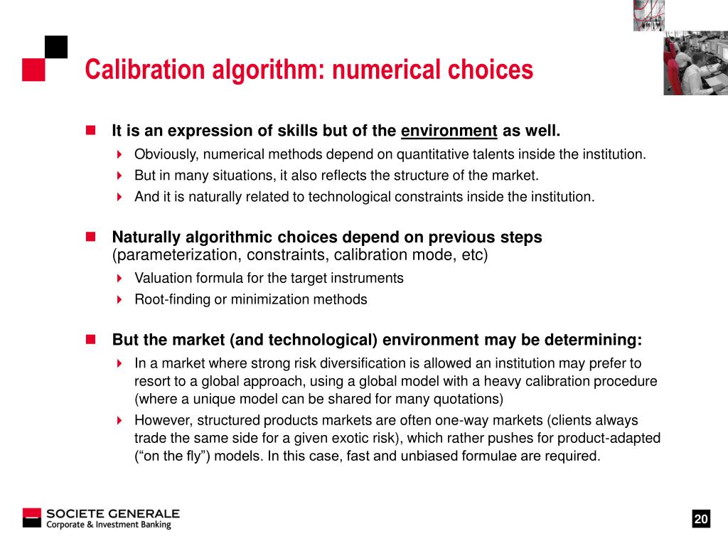 Calibration algorithm: numerical choices • It is an expression of skills but of the environment as well. • Obviously, numerical methods depend on quantitative talents inside the institution. • But in many situations, it also reflects the structure of the market. • And it is naturally related to technological constraints inside the institution. • Naturally algorithmic choices depend on previous steps (parameterization, constraints, calibration mode, etc) • Valuation formula for the target instruments • Root-finding or minimization methods • But the market (and technological) environment may be determining: • In a market where strong risk diversification is allowed an institution may prefer to resort to a global approach, using a global model with a heavy calibration procedure (where a unique model can be shared for many quotations) • However, structured products markets are often one-way markets (clients always trade the same side for a given exotic risk), which rather pushes for product-adapted (“on the fly”) models. In this case, fast and unbiased formulae are required.