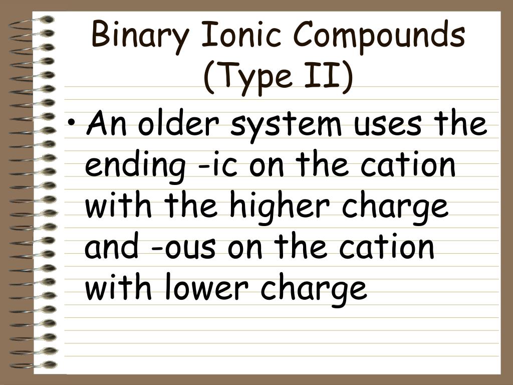 Binary Ionic Compounds (Type II) • An older system uses the ending -ic on the cation with the higher charge and -ous on the cation with lower charge