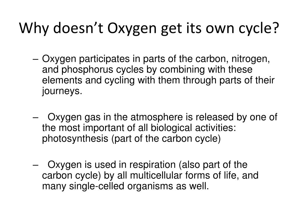 Why doesn’t Oxygen get its own cycle? • Oxygen participates in parts of the carbon, nitrogen, and phosphorus cycles by combining with these elements and cycling with them through parts of their journeys. • Oxygen gas in the atmosphere is released by one of the most important of all biological activities: photosynthesis (part of the carbon cycle) • Oxygen is used in respiration (also part of the carbon cycle) by all multicellular forms of life, and many single-celled organisms as well.